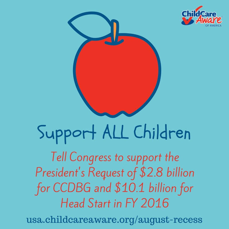 In addition to fully funding CCDBG, Child Care Aware® of America also encourages you to support the President's request of $10.1 billion for Head Start. Funding for Head Start will help expand access to critical early education programs for low-income children, as well as expand the Early Head Start-Child Care Partnership Program. Both of these budget items are critical for the future success of our children.
